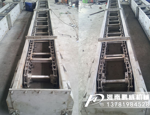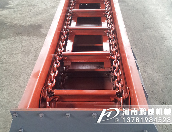 刮板輸送機的工作原理是,將敞開的溜槽,作為煤炭、矸石或物料等的承受件,將刮板固定在鏈條上(組成刮板鏈),作為牽引構件。當機頭傳動部啟動后,帶動機頭軸上的鏈輪旋轉,使刮板鏈循環(huán)運行帶動物料沿著溜槽移動,直至到機頭部卸載。刮板鏈繞過鏈輪作無級閉合循環(huán)運行,完成物料的輸送。